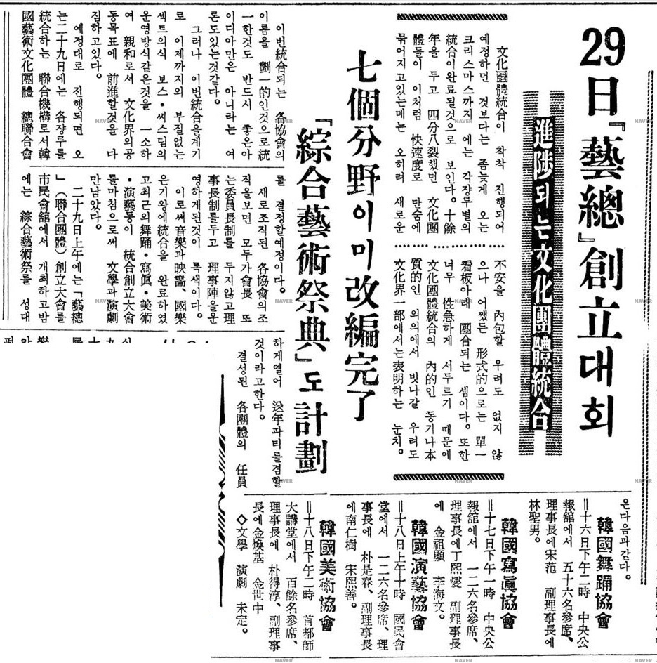 記事リード「文化団体統合が着々と進行し、予定していたよりは少し遅く、来るクリスマスまでには各ジャンル別の統合が完了すると見える。十余年のあいだ四分八裂していた文化団体がこのように快速度でひと息に括られていることに、むしろ新しい不安を内包する憂慮も無くはないが、いずれにせよ形式的には単一の看板をの下に団結するわけだ。あるいはあまりにも性急に急き立てたとから、文化団体統合の内的な動機や本質的な意義からはずれていく憂慮も文化界の一部で表明される雰囲気。」