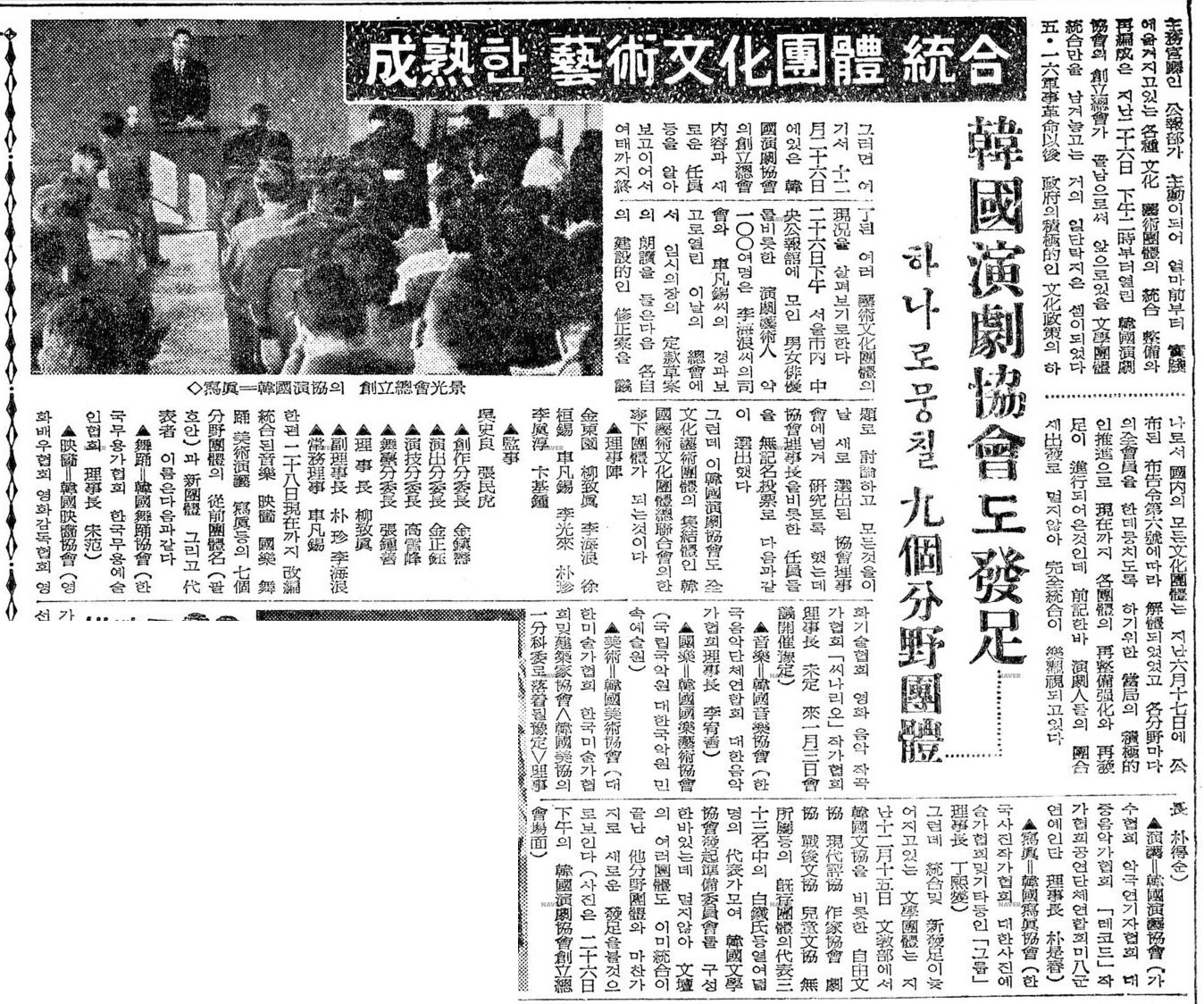 公報部が主導して各種文化芸術団体を統合した団体作りを行っていたが、演劇界も「韓國演劇協會」を発足させた。韓国演劇協会の発足を報じる朝鮮日報1961年12月28日付けの記事。